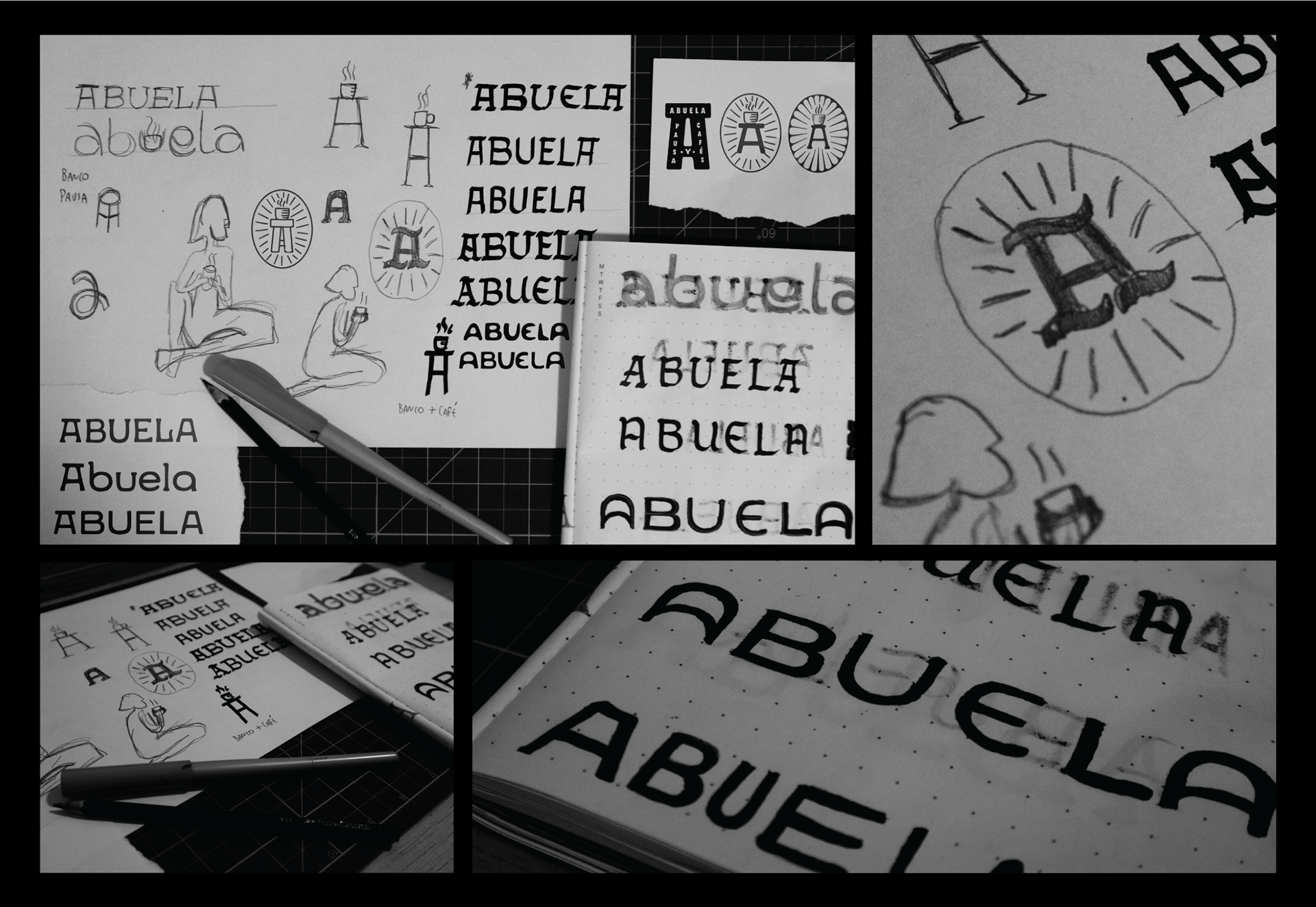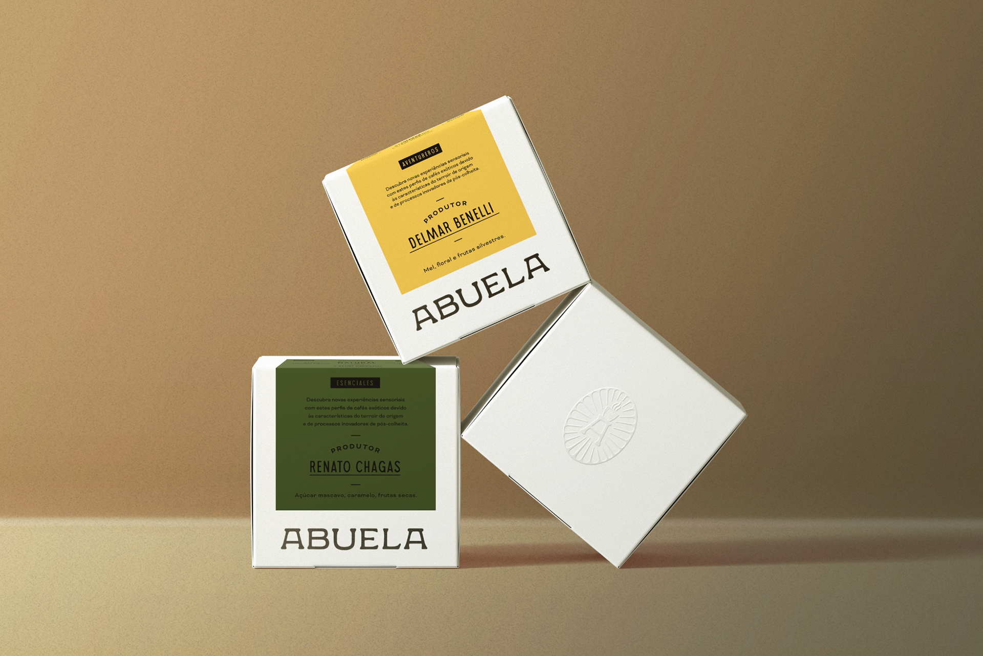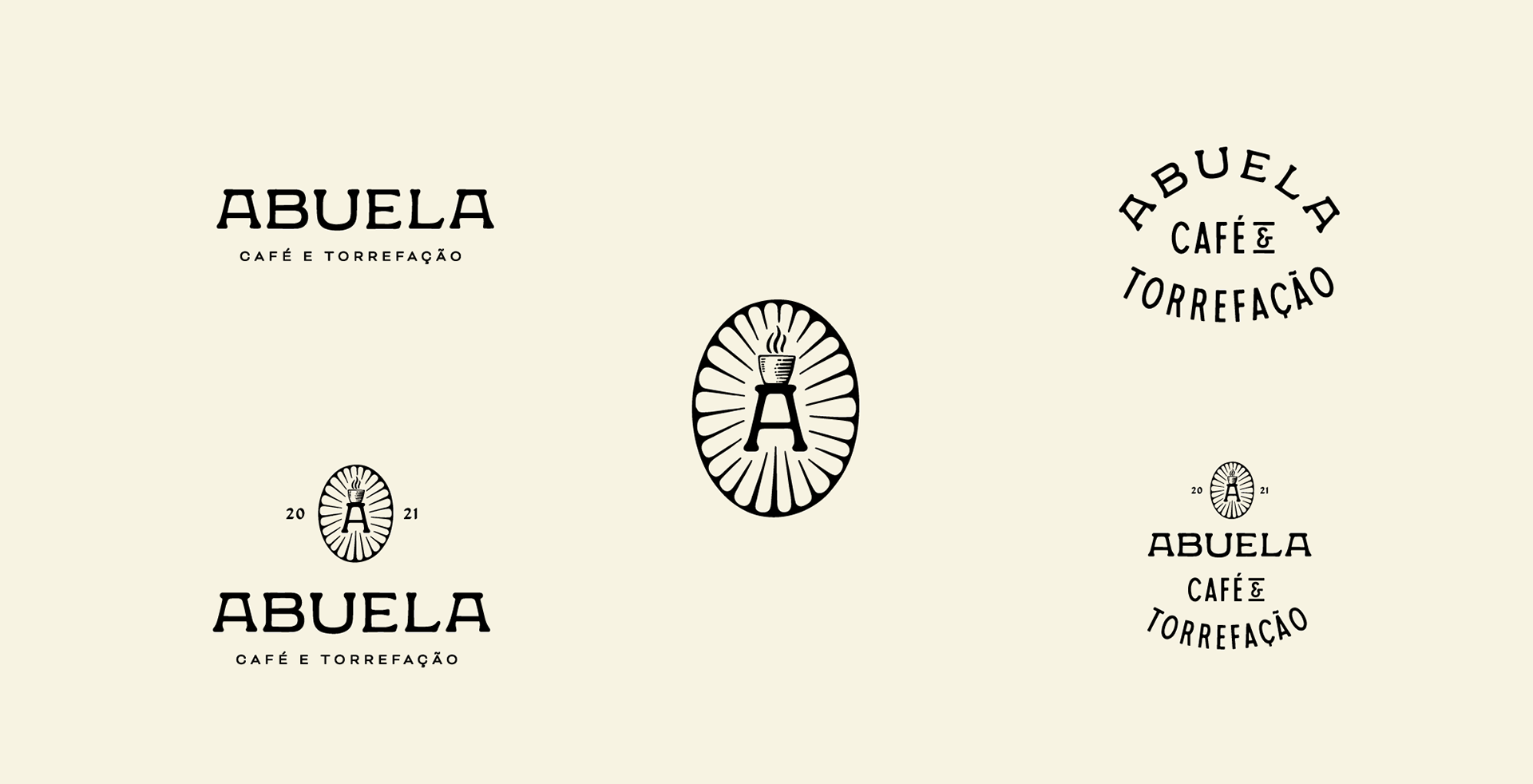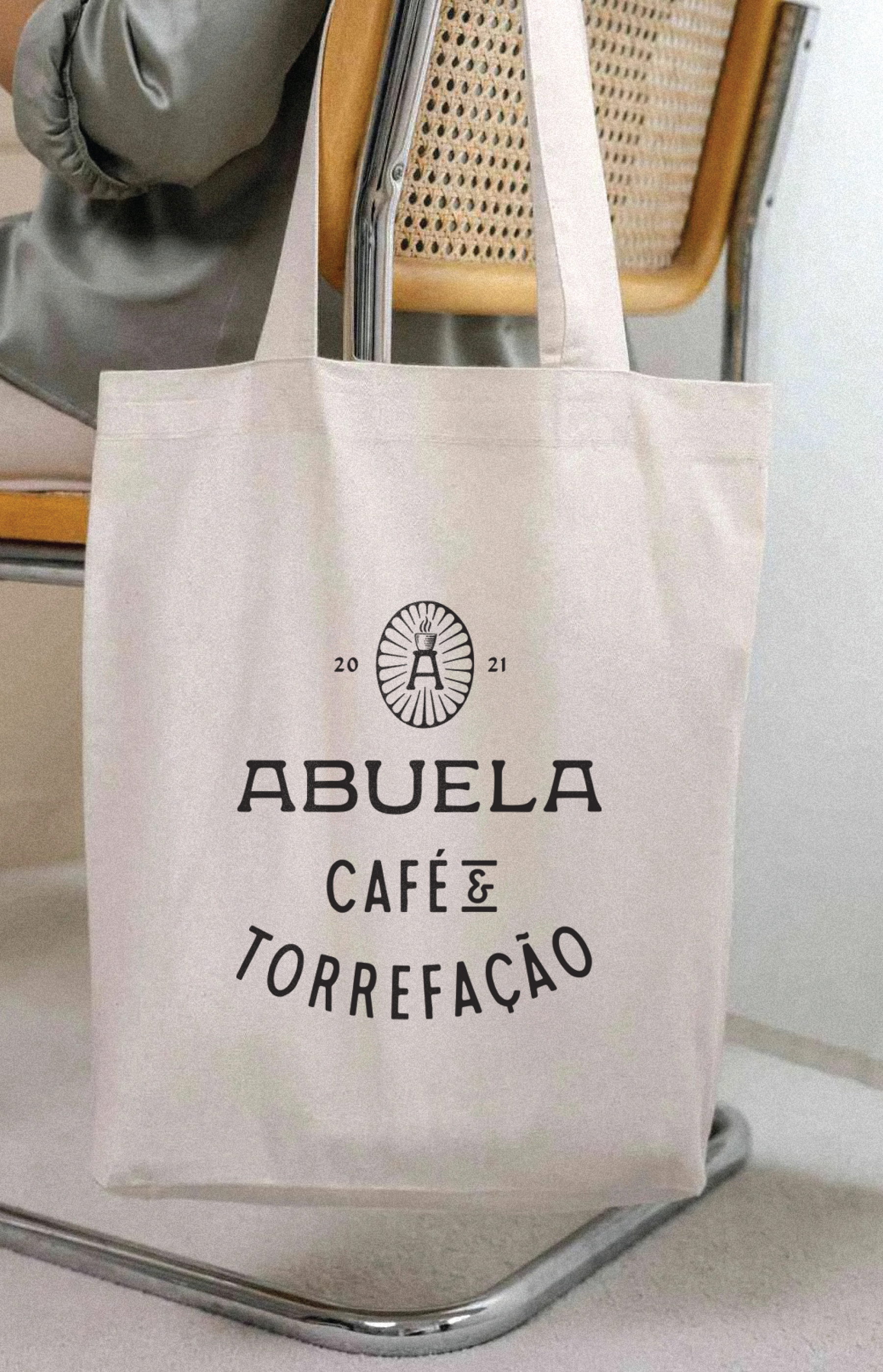 Com a marca criada, buscamos uma forma de isolar a letra A como ícone, trazendo o banco com um café sobre ele e um grafismo com a representação de algo sagrado, elemento que também agrega o cuidado e a importância que a Abuela dá ao café.