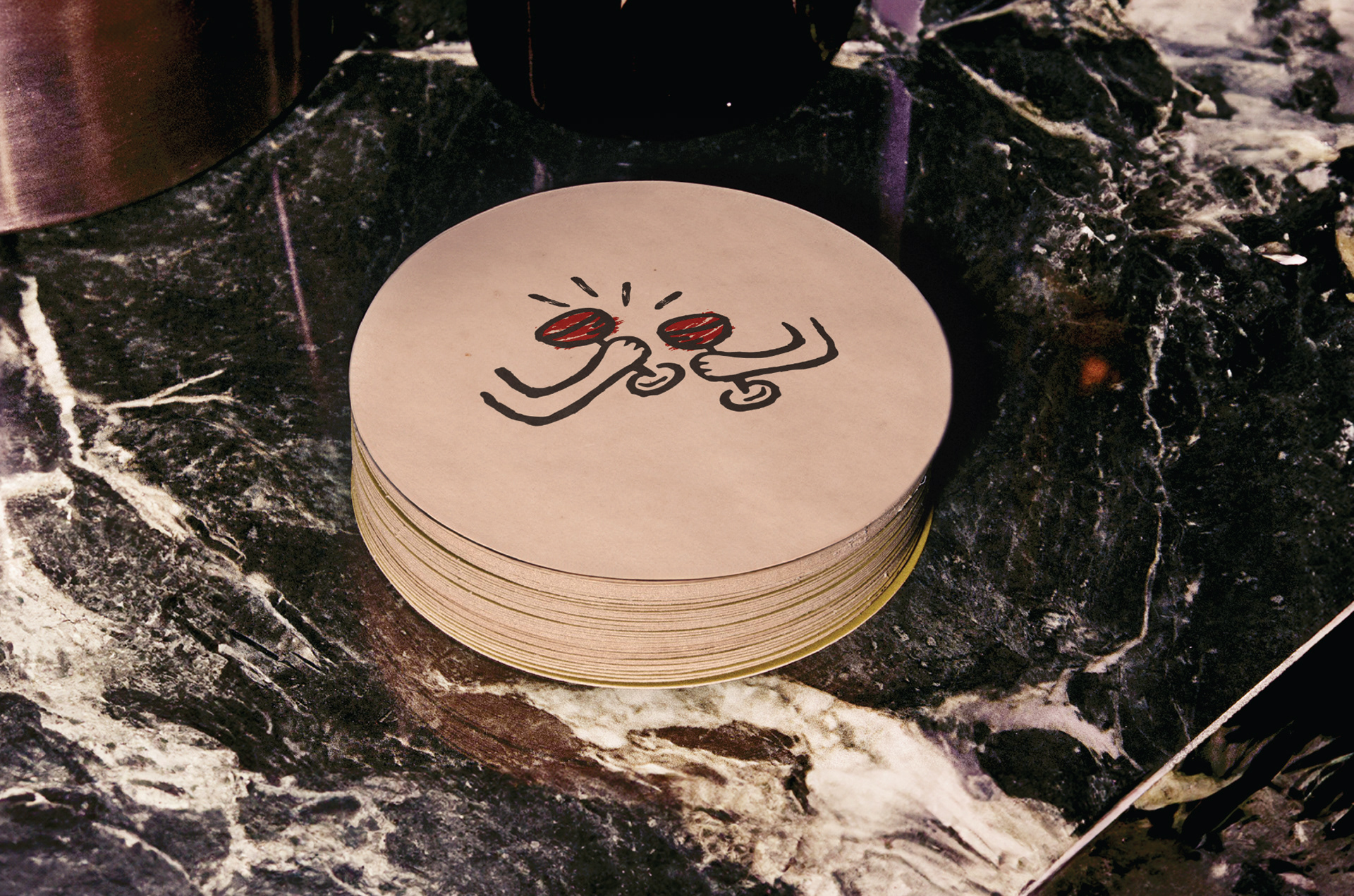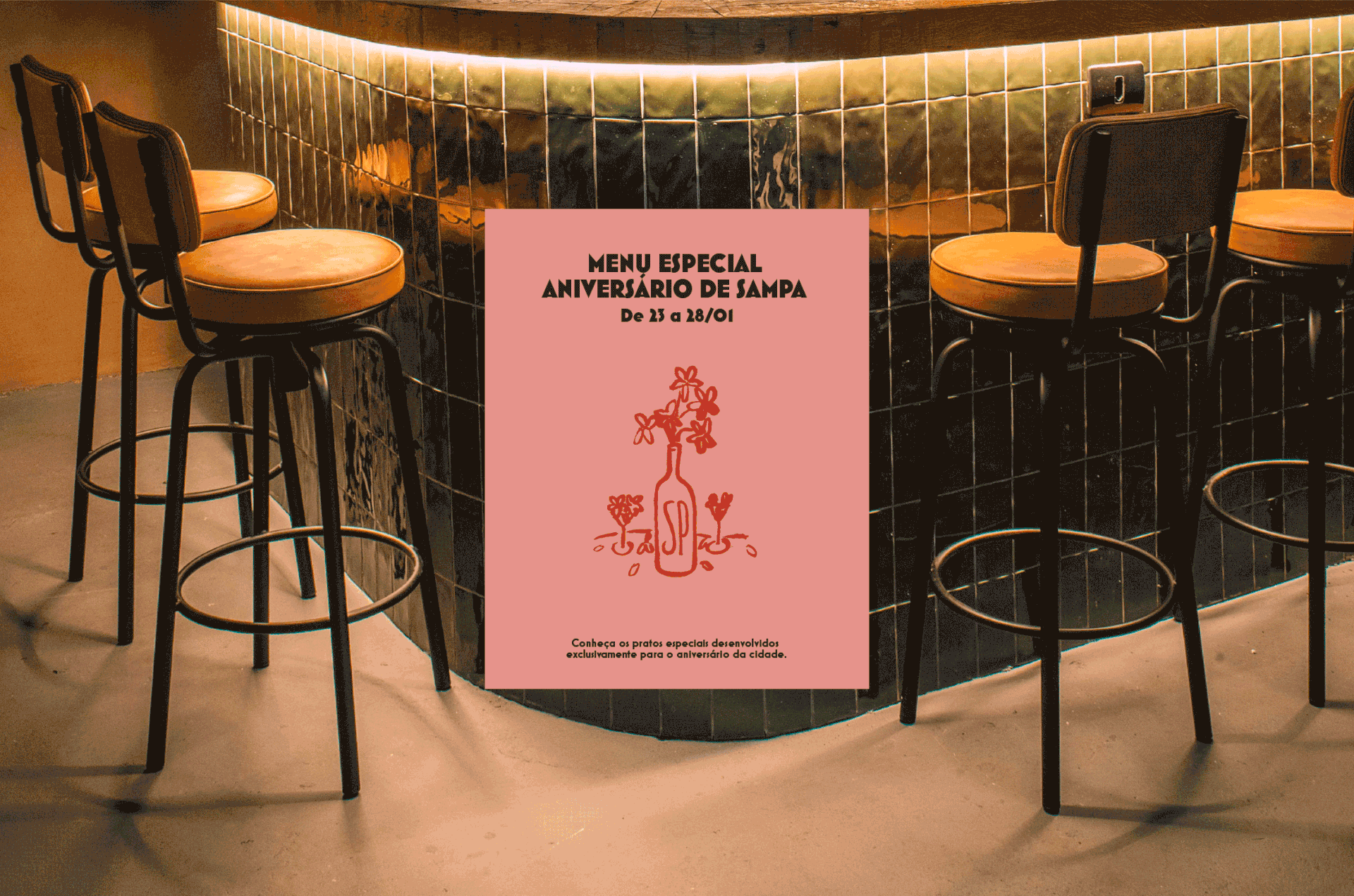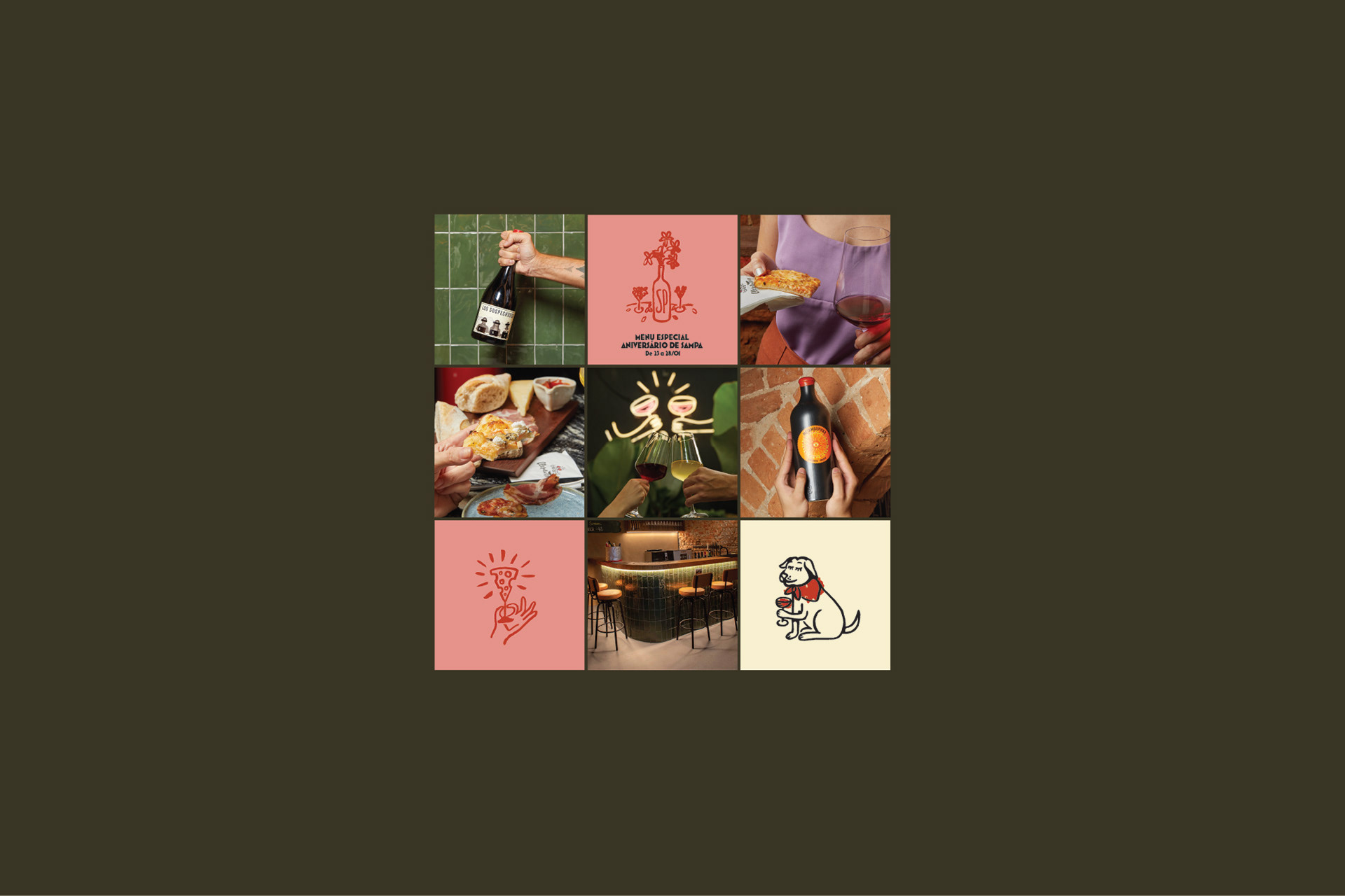 Com base nessa inspiração do nome, logo pensamos na possibilidade de incorporá-la como um elemento central da marca. Assim, concebemos um logotipo e um sistema gráfico com uma linguagem de desenho descontraída e leve. Essa abordagem, aliada a arquitetura única e a proposta acolhedora do bar, contribui para conferir a leveza que todo encontro para apreciar um vinho merece ter.